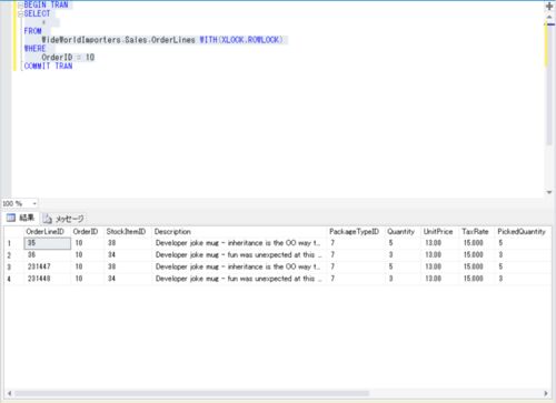 行単位にロックを獲得するため、下記のようなクエリを発行することがあるかと思います。 SELECT * FROM WideWorldImporters.Sales.OrderLines WITH(XLOCK,ROWLOCK) WHERE OrderID = 10 それでは下記のクエリをSQL Server Management Studio で実行してみまし…