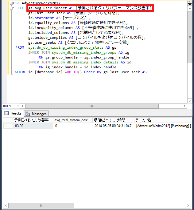 USE AdventureWorks2012 SELECT gs.avg_user_impact AS [Predicted query performance improvement rate], gs.last_user_seek AS [Time of last seek], id.statement AS [Table name] , id.equality_columns AS [Column that can be used for equality predicates], id.inequality_columns AS [Column that can be used for inequality predicates] , id.included_columns AS [Column required as included columns], gs.unique_compiles AS [Number of compilations and recompilations], gs.user_seeks AS [The number of seeks generated by the query] FROM sys.dm_db_missing_index_group_stats AS gs INNER JOIN sys.dm_db_missing_index_groups AS ig ON gs.group_handle = ig.index_group_handle INNER JOIN sys.dm_db_missing_index_details AS id ON ig.index_handle = id.index_handle WHERE id.[database_id] =DB_ID() Order By gs.last_user_seek ASC